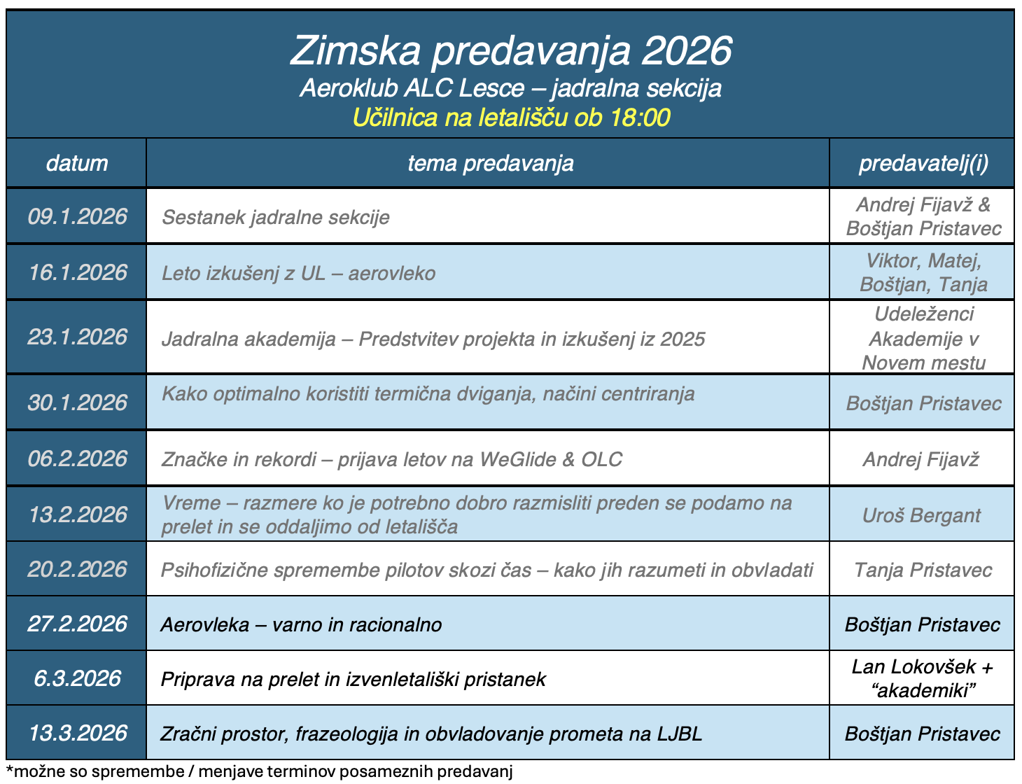 Dragi člani, vljudno vabljeni na petkovo predavanje, jutri, 27. 2. 2026, ob 18. uri, kot običajno v učilnici ali na daljavo. Tokratna tema bo aerovleka, ki nam jo bo predstavil…